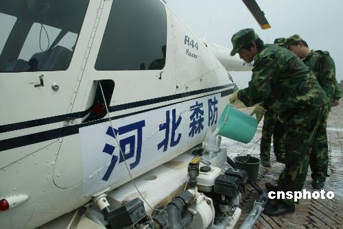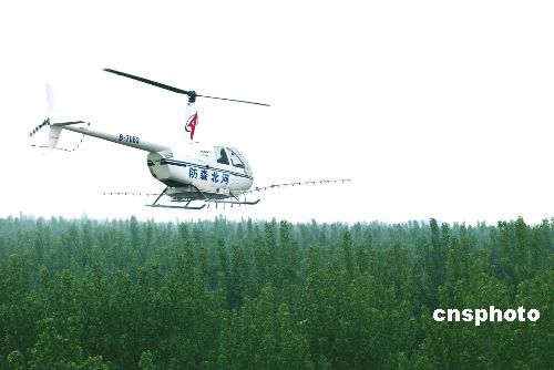 当前,美国白蛾入侵北京、河北林木的形势十分严峻。2006年9月中旬,根据美国白蛾的发生规律和特点,北京、河北首次使用直升飞机进行定点清除式飞防。据了解,截至2005年底,北京已在9个区(县)监测到美国白蛾,全市发生面积0.93万亩,祸及5万多棵树;河北全省受侵害面积已达90多万亩,共涉及40余个县(市、区)近300个乡镇。为防治美国白蛾,北京使用4个机场,分春、夏、秋3次飞机撒药防治林业有害生物,涉及12个郊区县,飞行作业450架次,防控总面积45万亩。中新社发 李惠均 摄
