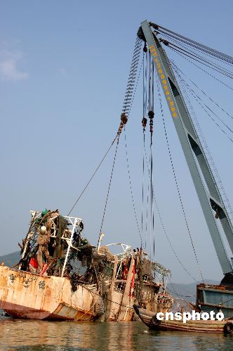 截止到九月十四日,“桑美”台风重灾区福鼎沙埕港已打捞出六十四艘沉船,其中钢质船只三十七艘,吨位都在150到200吨之间,目前主航道已经全面恢复通航。中新社发 王东明 摄