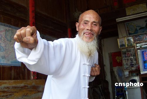 九月二十五日,广西桂林市临桂县祥田村九十四岁的廖金洲老人在练习“太平拳”。廖金洲一生坚持每日习武,掌握十多套拳法的他如今仍可轻易扛起百多斤的物品。祥田村共有四十二户人家、千余村民,其中百岁老人两人,九十多岁的十二人,八十多岁的四十二人,是远近闻名的长寿村。中新社发 王刚 摄
