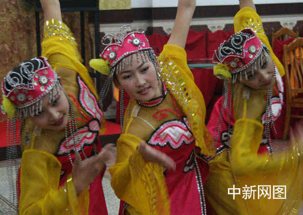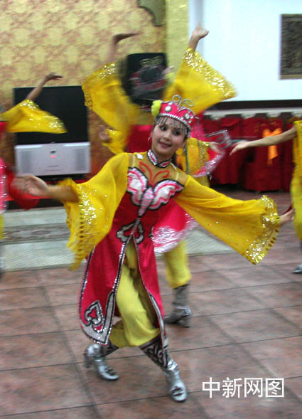 2006年9月25日,第二届中国网络媒体新疆行记者在塔城采访,当地的舞蹈演员表演了颇具民俗风情的达斡尔族民族舞蹈。 秦欣 摄