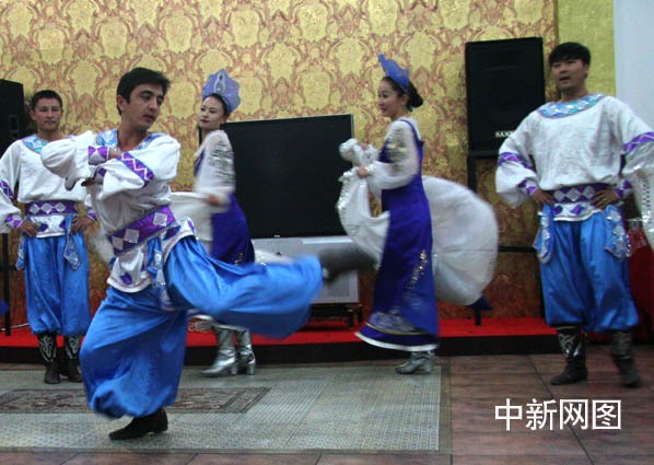 2006年9月25日,第二届中国网络媒体新疆行记者在塔城采访,当地的舞蹈演员表演了颇具民俗风情的俄罗斯族民族舞蹈。 秦欣 摄