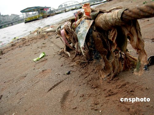 9月26日,黄河兰州段中立桥附近的河滩上成片塑料袋、草棍和一次性饭盒漂浮在河岸边的沙滩上,而钢丝绳上也是挂满了垃圾。据了解,当日中午11时,上游就开始漂下来许多生活垃圾,淌到中山桥时就形成了2000多米的垃圾带。兰州市环保局已经开始检测黄河水质,并查找污染源。中新社发 笑玉冰 摄