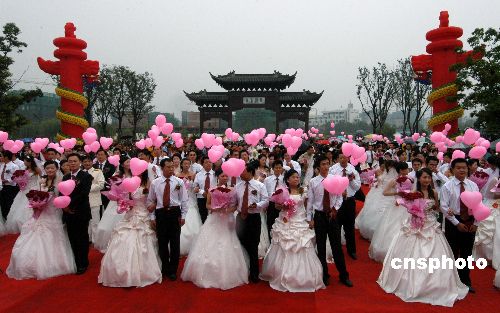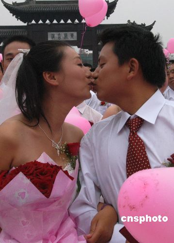 9月29日,“千年运河、百年姻缘”百对新人大型集体婚礼在扬州古运河畔东关古渡举行,一百多对新人在当天携手走进了婚礼的殿堂,与心爱的人共结百年之好。中新社发 赵大军 摄