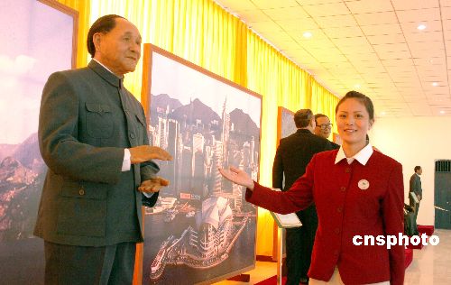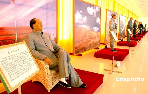 10月2日,一名工作人员在刚落成并对外开放的“中国伟人名人蜡像馆”作解说。“中国伟人名人蜡像馆”座落在四川华蓥山石林风景区内,占地面积800平方米,馆内塑有毛泽东、朱德、刘少奇、周恩来、邓小平、江泽民和鲁迅等10位伟人名人的形神兼备、栩栩如生的蜡像。蜡像馆10月1日对外开发放。中新社发 邱海鹰 摄