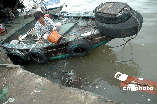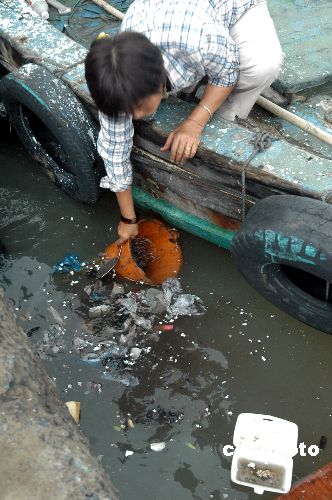 2006年10月2日,在海口新港港池边,一位妇女将渔船上的生活垃圾直接倒入海里后,舀海水清洗塑料桶。台风“象神”远去,在海口市新港和海口港等港池沿岸均可见到垃圾漂浮物,形成刺目的白色污染。据了解,这些垃圾大多是避风船舶随意倒弃的,因国庆节放假,一时无人清理。中新社发 善平 摄
