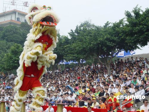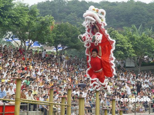 “黄飞鸿杯”世界狮王争霸赛10月2日在广东南海西樵山落下帷幕。广东佛山黄飞鸿狮队夺取狮王宝座,韩国龙狮武术总会狮队和香港队分获第二和第三。 图为南单腿飞跃,凌空推进,南狮最高难度动作“C级”动作表演。中新社发 孙建驹 摄