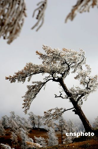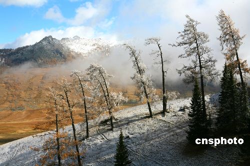 10月5日,新疆喀纳斯景区出现秋季罕见的雾凇奇观,为黄金周前来喀纳斯旅游的游客增添了一份新奇。中新社发 刘新海 摄