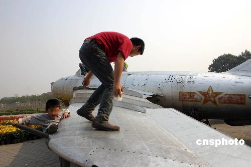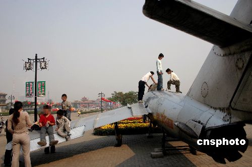 图为退役飞机上站了7个人。“十一”黄金周刚过,让江苏连云港市海州朐阳门的一架平时用于国防教育的退役战机伤痕累累,惨不忍睹。节日期间,充满好奇心的市民和游客不但眼看手摸,甚至还不遗余力地爬到飞机上蹦跳踩踏。机身上吃剩的瓜子、杂物遍布,另有好多地方留下了游人乱划乱刻的“杰作”。中新社发 朱华南 摄
