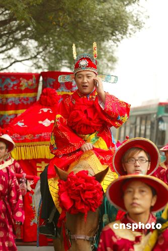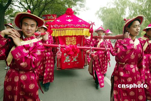 十月十五日,北京一对新人采用中国传统婚礼的方式来庆祝大喜之日。在各种不同形式的婚礼中,一些新人选择场面热闹的古装传统婚礼形式引人注目。中新社发 杜洋 摄
