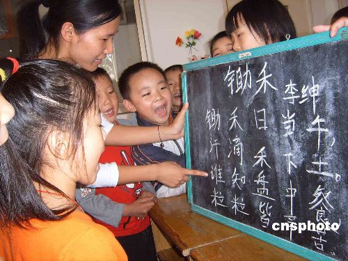 10月16日,江苏淮阴师范学院一名大学生教小学生朗诵唐诗《锄禾》。当日是第26个“世界粮食日”,江苏淮安清河小学开展主题为“爱惜粮食,从我做起,从小做起”的爱粮节粮宣传活动。中新社发 李加美 摄