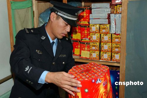 近日,北京警方在通州一市民家中的大衣柜内查获存有大量非法烟花案。经清点,共查获大地红21箱,闪光雷13箱,6寸礼花弹13箱及其他各类烟花爆竹38箱,销售价值6万余元人民币。目前,此案正在进一步审理中。中新社发 李连杰 摄