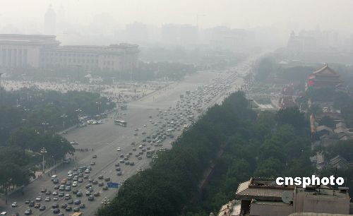 10月18日午后,北京市中心的天安门广场和周边地区被浓重的烟雾所覆盖,似乎变成了海市蜃楼。北京人一向自豪的九月、十月秋高气爽、蓝天白云的金秋季节,在超级都市自身排放的大量污浊气体污染下正在逐步褪色,只有强劲的北风和雨水才能使北京的天空清澈。中新社发 任晨鸣 摄