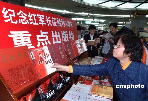 10月18日,北京西单图书大厦纪念中国工农红军长征胜利70周年重点出版物柜台前人头攒动。中共党史出版社精心策划,从研究类、资料类、纪实类等多个角度出版了《长征行》等近20部纪念图书,用不同手法记述了中国工农红军历尽艰辛、取得万里长征胜利这一伟大壮举,具有较高的学术价值和资料价值,有的填补了长征研究的空白。中新社发 李树贵 摄