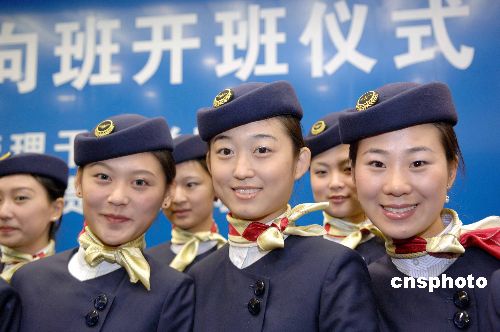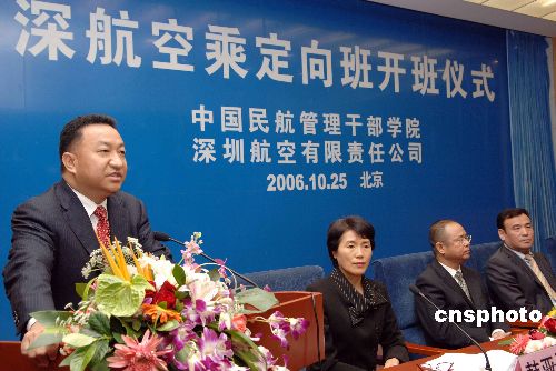 十月二十五日,深航在北京民航管理干部学院举行“深航空乘定向班”开班仪式,这是由深圳航空公司和中国民航管理干部学院联合举办的首个民航定向乘务培训班,开创了民航空中乘务员招收、培养的新模式。中新社发 陈文 摄