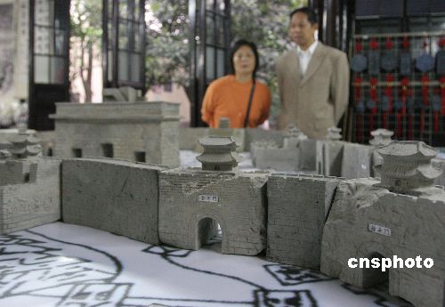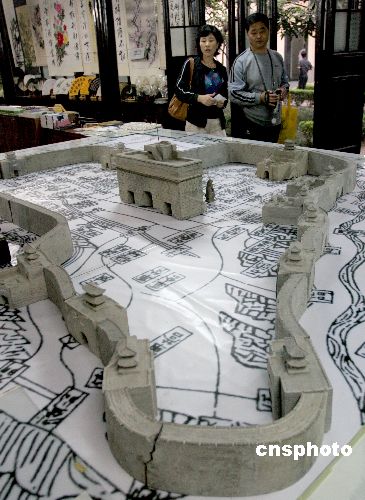 10月25日,游人参观“明城墙”。一座用废弃城砖雕出有13座城门的微缩版“明城墙”日前在南京“总统府”内与游人见面。这些砖雕城门、城墙是南京六十多岁的浦效信老人根据历史资料、现有城门及专家建议确定模型后,用废弃城砖历时8年精心雕刻而成。中新社发 文宝 摄