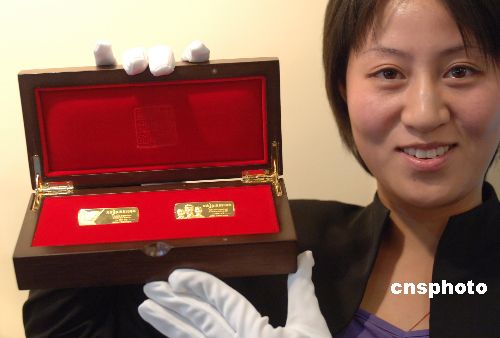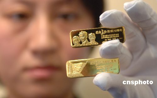 10月26日,为纪念长征胜利70周年,“长征金条”开始在国内一百多家经营店公开发行。“长征金条”每根重25克,每套有2根,售价为16000元人民币。每套金条都有唯一编号和中国国家博物馆出具的监制证书。长征决策者之一的王稼祥形象与毛周形象并列,出现在金条上。中新社发 邹宪 摄
