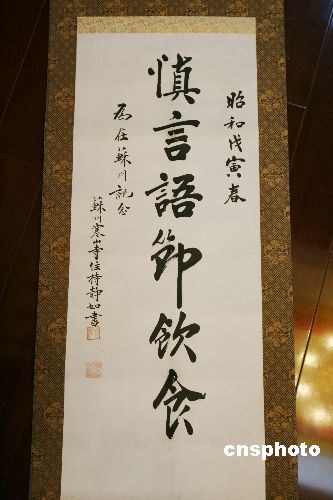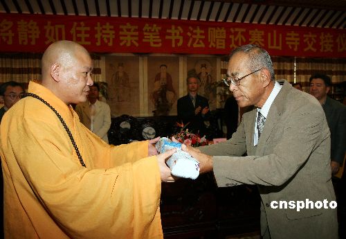 10月27日,日本友人中野荣治向寒山寺住持秋爽法师赠送书法作品。此幅书法作品系上世纪30年代苏州寒山寺住持静如法师所写,表达了对日本不义战争的告诫。68年后今天,日本友人中野荣治携带当年静如法师赠送其父的书法作品送还寒山寺,是为了完成其父中野荣作的生前遗愿,以表达其在历史上曾经参与侵华战争的悔过之意。中新社发 徐志强 摄