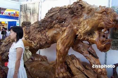 十一月一日,在广西南宁举办的中国东盟博览会上,柬埔寨展商的一头根雕雄狮引得观众纷纷合影。据老板称,这头狮子长三米六,高两米六,重达一吨,价值超百万元人民币。中新社发 王刚 摄