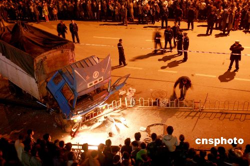 十一月六日晚七时左右,一辆中型货车在昆明市兴科路冲上路旁公交车站台,导致一人当场死亡,八人受伤。 事故发生以后,昆明警方及时赶至现场,组织抢救伤员,勘查现场,八名伤者被送往医院,除一人伤势较为严重外,其余伤者伤情基本稳定。目前,肇事驾驶人李候芝已被公安机关刑事拘留,事故详情正在进一步调查当中。图为事发后警方在做现场勘察。中新社发 杨映波 摄