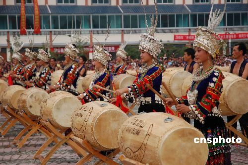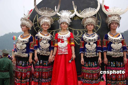11月10日,2006中国贵州雷山苗年文化周在贵州省雷山县开幕,苗族同胞们齐聚县城欢庆一年一度的苗族新年。开幕式上,当地苗族同胞身着的华丽盛装,成为一道亮丽的风景,吸引了游客的眼球。据悉,文化周期间将举行赛装会、服饰展演、斗牛及斗猪等群众文娱活动。苗年节是当地苗族同胞最为隆重的节日之一。中新社发 吴如雄 摄