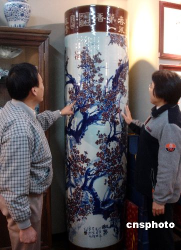 11月初,一只标价高达28万元的巨型青花釉里红箭筒亮相江苏苏州一家陶瓷精品坊。该只箭筒高2.2米,直径60厘米,由江西景德镇数名陶瓷工艺师历时6个月制作而成。中新社发 王建康 摄