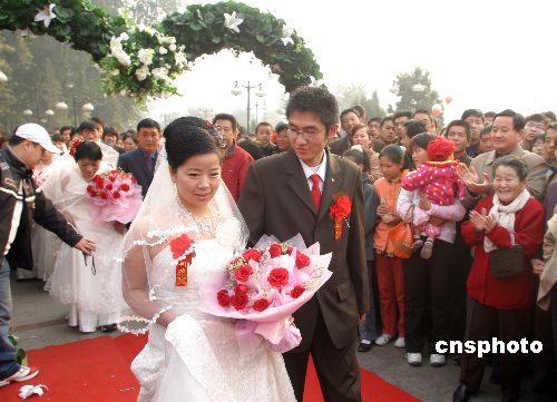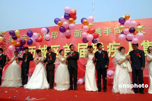 11月18日,在济南市洪楼广场,7对残疾人新婚夫妇携手走过红地毯。当天,由济南市残联、历城区政府联合举办的“身残志坚心相印、新人携手向明天”残疾人集体婚礼隆重举行。这次婚礼的车辆、场地等都由爱心人士及政府部门义务提供,新人们不仅免交一切活动费用,每对新人还获得了价值3000元的礼物。中新社发 龚辉 摄