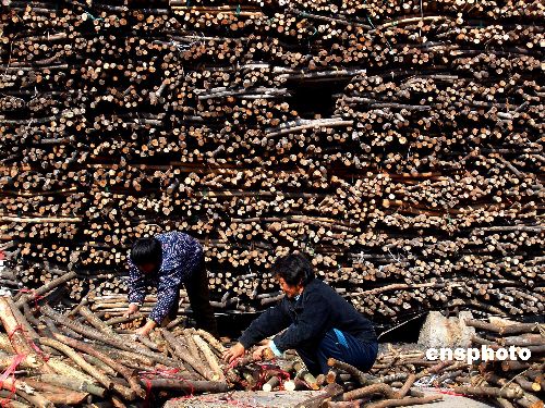 11月18日,安徽淮北市一企业的女工在整理加工木筷的木材。据不完全统计,目前,中国每年消耗一次性木筷450亿双,需砍伐约2500万棵大树,相当于中国一个木材大省一年的采伐量。中新社发 谢正义 摄