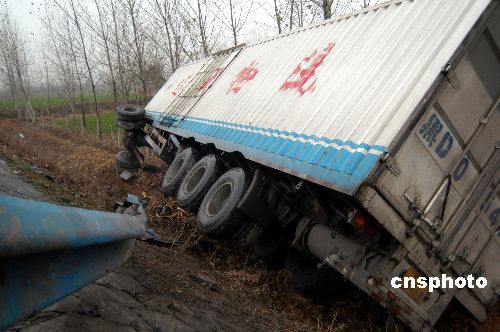 11月22日15时,京珠高速鹤壁段发生一起交通事故,两辆同向北京方向行驶的大货车,撞断高速公路护栏,翻入高速公路路基下,其中一辆大货车驾驶室与车体分离,司机室内一人当即死亡。鹤壁高速交警接报后迅速出警,组织人员施救,并分流车上货物。高速交警提醒司机,下雨路滑,应谨慎驾驶。中新社发 李国庆 摄