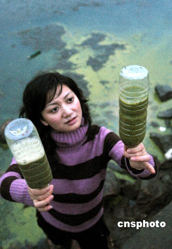 | 在湖州太湖流域采集的蓝藻水样。往年夏季是太湖蓝藻爆发季节,10月至次年2月蓝藻处于休眠期,但是今年,至现在太湖的蓝藻还在持续爆发,大量蓝藻已逼近湖州市位于城西、城北的两大自来水取水口,直接威胁城区数十万市民饮水。该市自来水公司已经启动紧急预案,目前尚未给饮水安全造成明显影响。据了解,这次蓝藻肆虐的直接原因是污染造成的水体富营养化,当蓝藻大量繁殖时,水中的溶解氧浓度会迅速降低,造成鱼虾、螺蛳等水生物的死亡,使水体遭受污染。从实验结果来看,蓝藻对肝、脾都有一定的影响。中新社发 宋健浩 摄