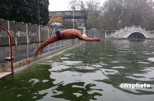 十一月二十三日,石家庄迎来今冬首场降雪。在平安公园室外游泳池中,众多冬泳爱好者劈波斩浪,乐在其中。这个冬泳爱好者组织有二百人左右,其中年龄最大者七十八岁,最小者只有十六、七岁。中新社发 张澍 摄