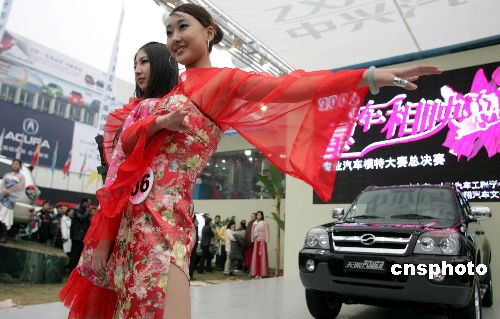 十一月二十五日,北京国际汽车展览会汽车模特大赛隆重开幕,十一位身着美丽汉服的模特亮相赛场,使美伦美奂的华彩汉服与现代时尚名车相应生辉。中新社发 武仲林 摄