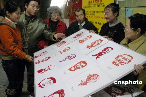 11月27日,在济南市大观园商场,市民正欣赏民间剪纸大师的剪纸作品《笑星》。这些作品是济南剪纸艺术院的5位民间剪纸大师,耗时近一个月剪制的,作品包括侯宝林、姜琨、郭德刚等我国几代相声演员及潘长江、李琦等小品演员,共100名笑星。作品采用传统的剪纸手法,配以夸张的形象设计,幽默地表现出笑星们的风采。中新社发 龚辉 摄