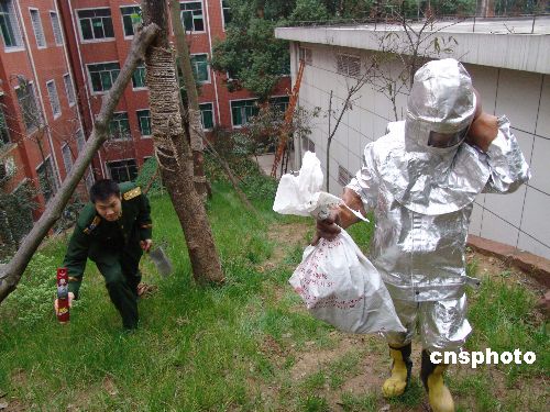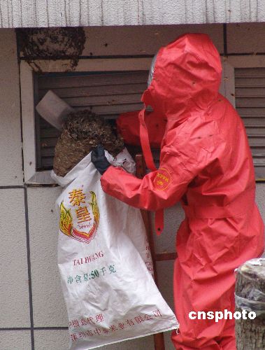 11月27日,消防战士成功摘取马蜂窝。武警重庆消防总队永川市消防中队接到重庆信息工程专修学院的求助电话,派出官兵来到校园进行实地勘查,之后,全副武装的消防战士在配电房等建筑物的屋檐下,爬上专用楼梯采用“口袋捂马蜂窝出口一举端掉”的方法,成功摘取了6个马蜂窝。为防止飞出的马蜂再次伤人,消防战士还启用了专用喷雾剂对其窝巢周围进行喷洒。中新社发 陈仕川 摄