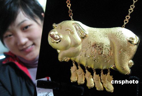 11月27日,在安徽省亳州市新华路的上海老庙银楼,一位营业员正在展示“金猪”饰品。尽管这种印有“百年好合”字样、重41克的千足金挂件价格不菲,但由于造型新颖别致,一头可爱的“金猪妈妈”正在哺育六头“金猪娃娃”,据营业员称购买者不少。2007年是农历猪年,虽然离春节尚早,但在亳州各大金店、银楼都可以发现,与生肖猪有关的黄金饰品已经开始升温。中新社发 张延林 摄