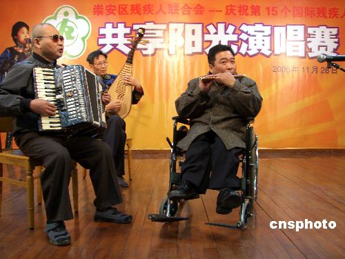 11月28日,江苏无锡崇安区残联为庆祝第15个国际残疾人日,举办演唱会比赛,全区100多名残疾人报名参赛选拔出25名进入比赛。图为肢体残疾人华万放正在用笛子吹奏《扬鞭催马运粮忙》。中新社发 盛国平 摄