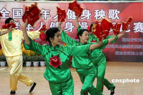 十一月二十八日,由中国体育总局社会体育指导中心、中国老年人体育协会等机构主办的,二00六年全国老年人健身秧歌、中老年人健身腰鼓、老年人健身操三项比赛,在福建省武夷山举行,来自北京、上海、江苏、云南、宁夏、内蒙古等地的四十七支代表队一千余人参加比赛。图为老年健身秧歌舞出青春风采。中新社发 周文杰 摄