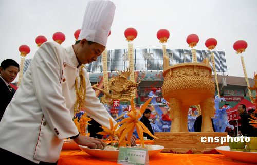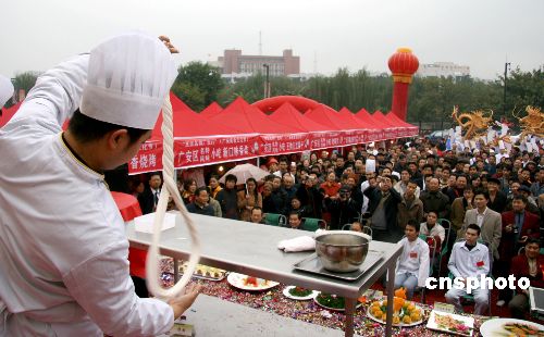 11月28日,北京、广州、湖南、重庆等地的烹饪名师云集四川广安,挥刀操勺,各展厨艺。当日是全国各地知名烹饪大师云集广安切磋厨艺第一天,旨在倡导“绿色、营养、健康”的餐饮消费新理念。中新社发 邱海鹰 摄