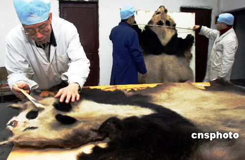 重庆警方12月1日透露,两张总价值200万元的大熊猫皮经过重庆市自然博物馆四名专家半个多月的紧急修补,将于近日在重庆警察博物馆展出。这是当地警方在2001年破获的、重庆直辖以来第一起特大非法出售大熊猫皮案中的“赃物”。中新社发 郭晋嘉 摄