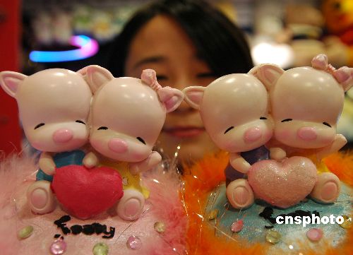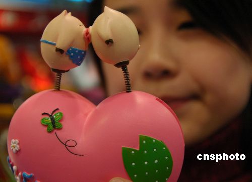 12月4日,扬州一家饰品店内,营业员展示富有时尚个性的“情侣猪”饰品。距离农历猪年还有一段时间,扬州市场上以“猪”为主题的喜庆饰品纷纷亮相,受到年轻人的喜爱。中新社发 张丙涛 摄
