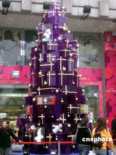12月7日,苏州观前街上一商家用包装礼盒制作了一棵7米高的“圣诞树”,吸引了众多行人的目光。随着圣诞节的临近,苏州街头圣诞气氛渐浓。中新社发 王建康 摄