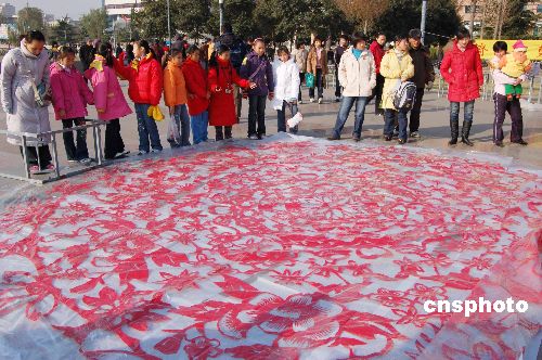12月9日,在济南泉城广场上,一张面积达三十多平方米的特大剪纸吸引许多市民和游客驻足观看。当日,“2006济南国际幽默艺术周”在济南泉城广场举行,为了让每一位市民都体会到艺术周的欢乐气氛,一些剪纸艺术家在活动现场表演了精湛的技艺。中新社发 耿国庆 摄