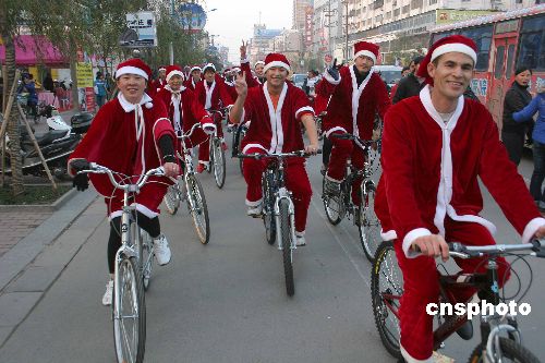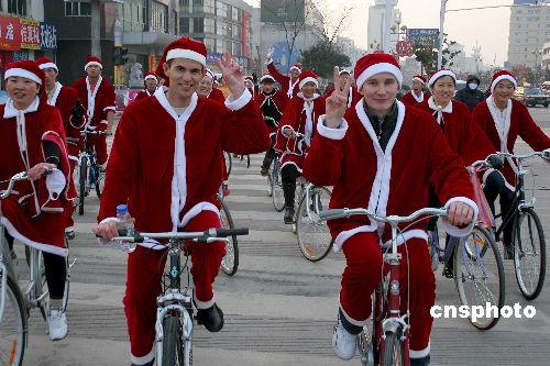 12月10日,在江苏连云港街头,众多中外“圣诞老人”进行骑车比赛。为营造圣诞节气氛,当天,江苏连云港某酒店举行圣诞老人街头自行车赛,该酒店100余名中外工作人员扮成圣诞老人模样在街头骑自行车比赛,吸引了众多过往行人的目光。中新社发 穆道勇 摄
