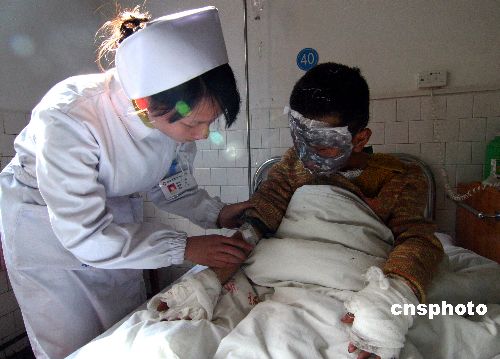 12月15日,一名在煤气爆燃事故中头部受伤的学生在湖南娄底中心医院接受治疗。12月14日下午1时40分许,3名小学生结伴上学经过湖南娄底大科街时,地下煤气管道突然发生爆燃,造成2名学生脸部、手部不同程度烧伤,1名学生被爆炸产生的气浪摔伤,3名学生被送往医院接受治疗。事故原因在进一步调查中。中新社发 郭国权 摄