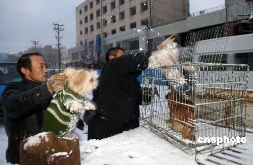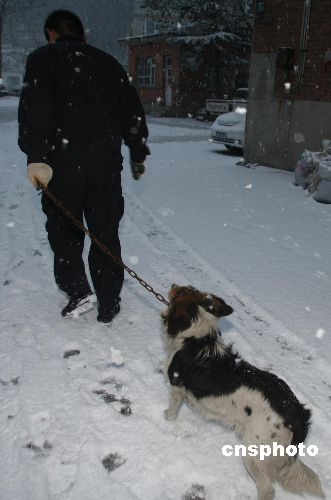 12月16日,大连犬类稽查队对市区遇期不登记办证(注册)的违规养犬行为进行清理整顿。当日早晨风雪交加,大连犬类稽查队会同市内四区犬类稽查队,利用周六、周日,在早晚遛狗重点时段深入社区、公共场所和繁华地段进行集中整顿行动。中新社发 卢沙 摄