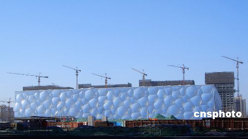12月16日,已基本成型的北京奥运水立方工程在蓝天的映衬下显得格外的美丽。中新社发 玉龙 摄