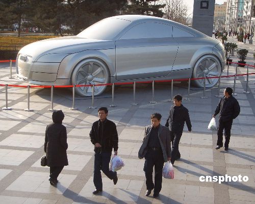 12月16日,在北京东单路口,一辆巨型车模现身街头,成为一道别致的风景,格外引人注目。中新社发 玉龙 摄