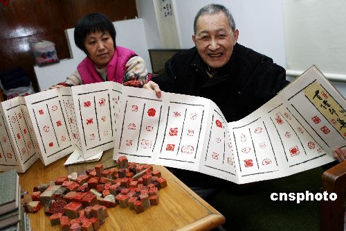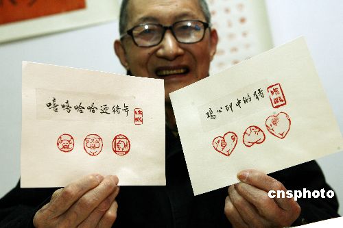 江苏苏州91岁高龄的矫毅老人,每年刻100枚新年生肖印章迎新年,已坚持20余年。图为矫毅在展示自己的篆刻作品《百猪印集》,其中的“印章猪”形态各异、生动活泼。中新社发 徐志强 摄