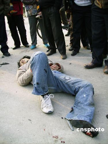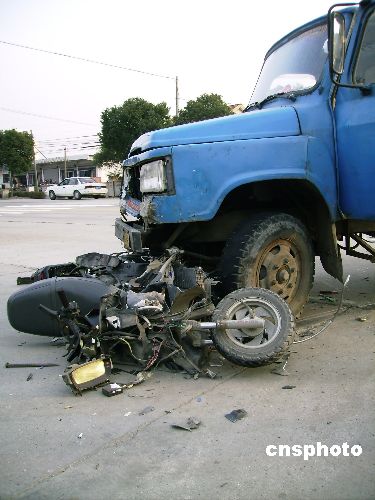 12月20日下午3时40分许,在江苏苏州机场路昆山千灯段发生一交重大交通事故,一辆卡车与一辆摩托车发生相撞,摩托车被撞成一堆废铁,车主被撞出一两米,摩托车主受伤严重,被紧急送往医院急救,全身骨折。事故发生后,卡车司机不知去向。目前,警方在作进一步调查。中新社发 李俊锋 摄