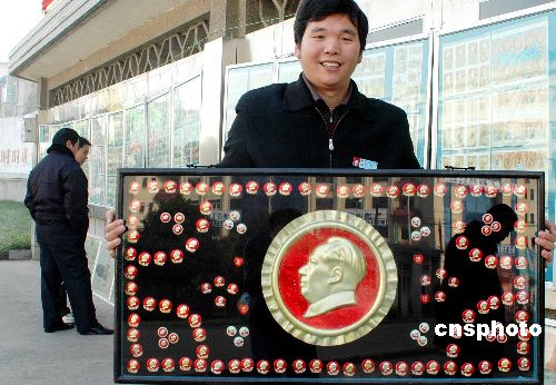 12月20日,安徽淮北市工程建设公司职工徐长良为纪念伟大领袖毛泽东诞辰113周年举办个人藏品展。徐长良在上世纪八十年代初迷上收藏,2001年他到南京参加全国邮展,一套毛泽东题材的展品引起他的兴趣。从那时起,他开始收藏毛泽东题材的电话卡。五年来,他跑遍了北京、上海、南京等地古玩收藏品市场,回收毛泽东题材的电话卡。至今他陆续收藏毛泽东题材的电话卡12400多种共计3000多枚。中新社发 山丘 摄
