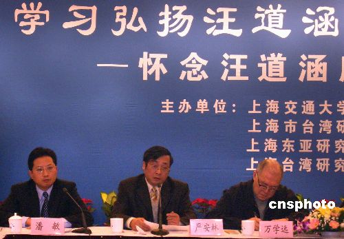 一年前的十二月二十四日,海协会会长汪道涵在上海逝世。十二月二十二日,大陆各界人士聚会汪老母校上海交通大学,举行“怀念汪道涵”座谈会。来自上海东亚研究所、上海台湾研究所等机构的学者发言,汪道涵亲属汪静夫妇等与会。中新社发 许晓青 摄